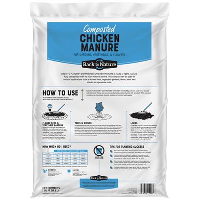 New: Spread 1/2″ to 1″ Composted Chicken Manure over the entire area to be planted. Till into existing soil, mixing thoroughly. Lay sod or sow seeds according to directions. Water thoroughly, then resume regular watering schedule.