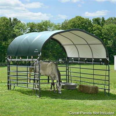 The Corral Shelter livestock shade is a multi-purpose, portable shade and shelter structure and one of our most convenient equine innovations, yet. This portable shade solution has a sturdy frame with a premium powder-coated finish to resist rust and corrosion. The universal cover fits most panel tube profiles (whether round, square or oval) tightly and securely to provide reliable shade protection anywhere in the field for horses, goats, most livestock and even agricultural storage. The unit features patented ShelterLock Steel Stabilizers and anchors securely to the ground for reliable shade.