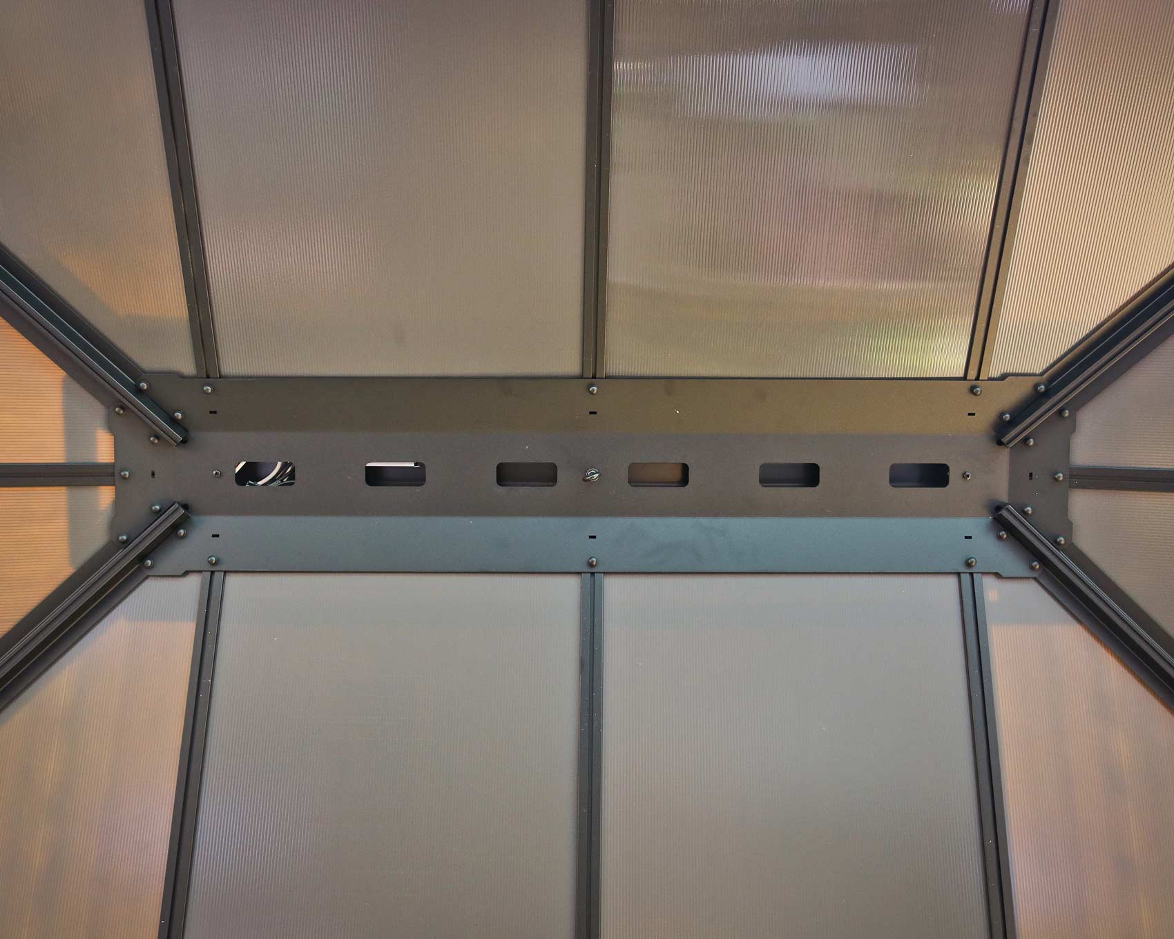 • Virtually unbreakable 6 mm twin-wall polycarbonate roof panels are high impact and shatter resistant • Withstands severe weather conditions – no need to remove panels during winter season • Maintain their integrity, provide complete UV blockage, and are 100% UV protected; they do not discolour, fracture or become brittle over time • Ready to assemble pre-cut panels