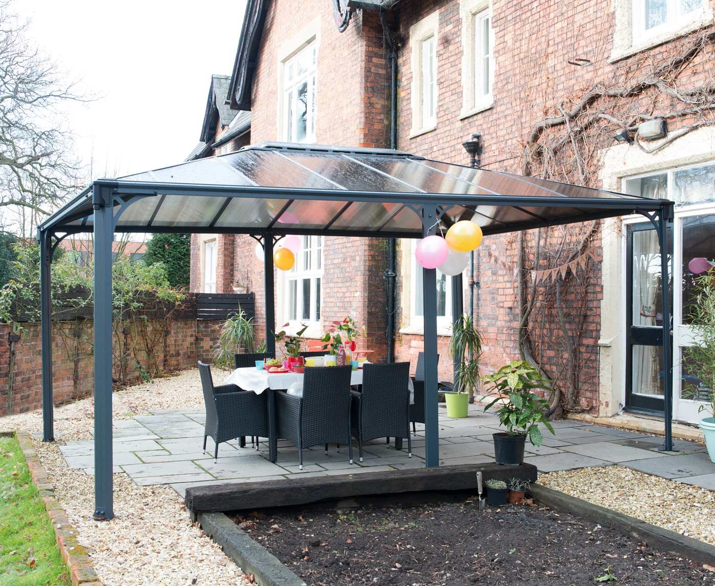 A 10 year limited warranty is standard on CANOPIA – PALRAM’s Gazebo range, beware of competing products with only a short, 12 month warranty, ours are built to last! Cheaper units are only built to last for 1-2 years, within that time their roof will break down, crack and yellow in the harsh Australian sun, our CANOPIA – PALRAM brand will not! This Gazebo stands out from the rest with its very long 5 meter stance, enough room for a very large dining table and chairs in your backyard. Gazebo for sale Australia free delivery.