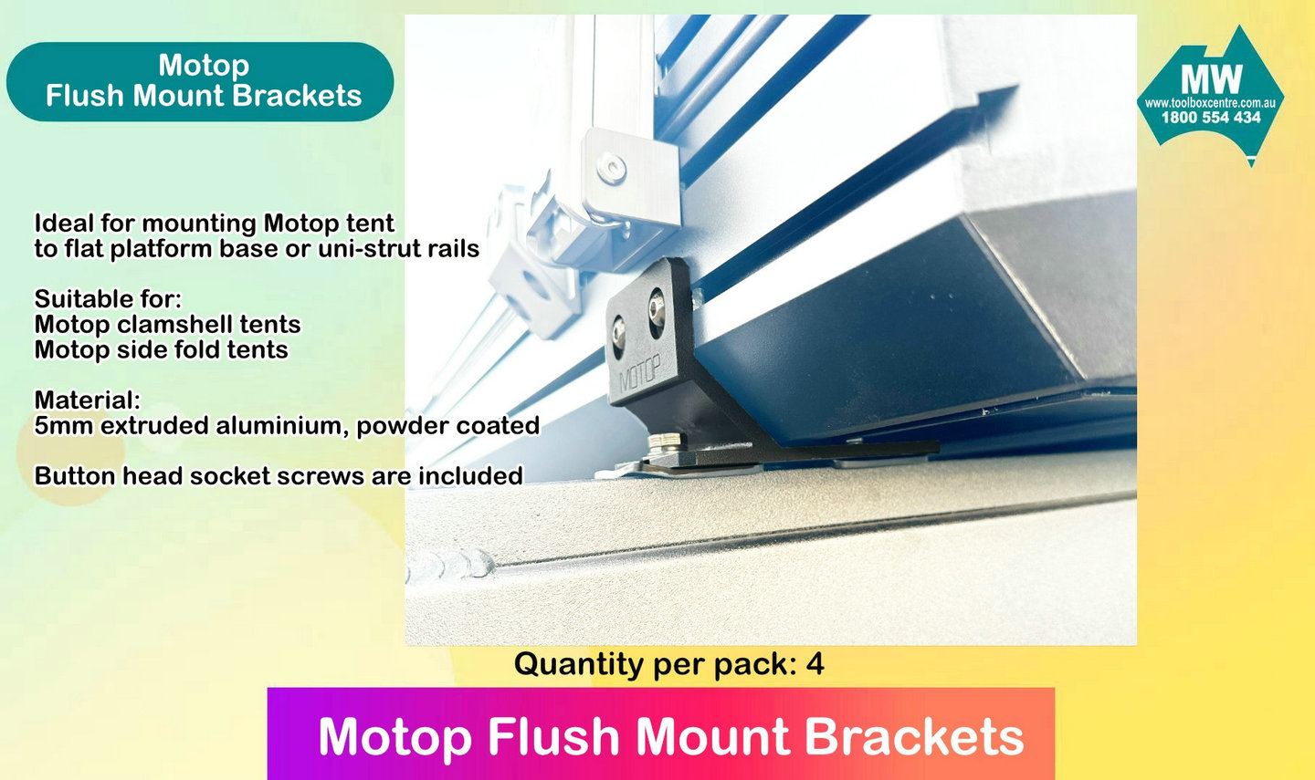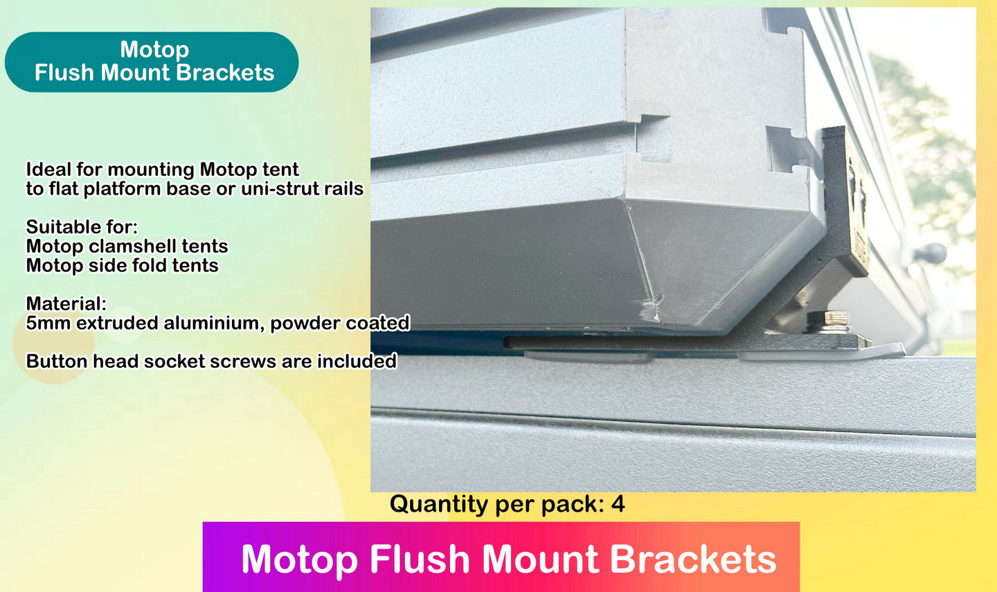 Suitable for mounting your Motop clamshell roof top tents or side fold tents on to flat platform or uni-strut rails.