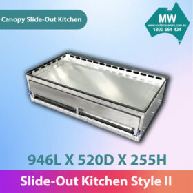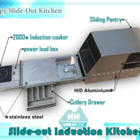 - Included internal features: stainless steel sliding tables x2, induction cooktop (1550mm option only); cutlery tray, storage space with dividers; stainless steel sink and twin taps.
